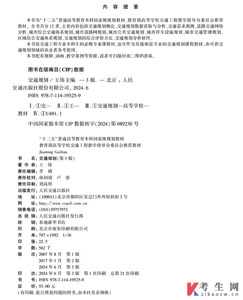 注 意 各省相同课程的指定教材不一定相同,请确认该教材版本正确再购买。该教材版本:《交通规划(第3版)》 王炜 人民交通出版社 2024