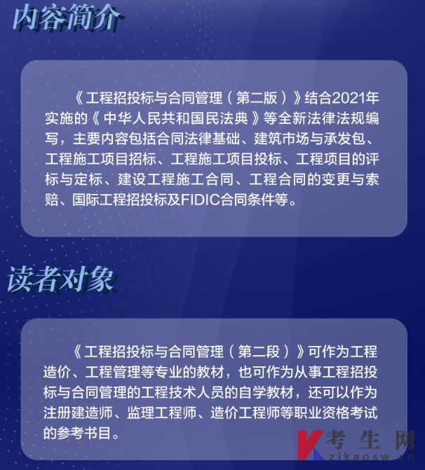 注 意 各省相同课程的指定教材不一定相同,请确认该教材版本正确再购买。该教材版本:《工程招投标与合同管理》 李丽红主编李朔副主编 化学工业出版社 2022年版