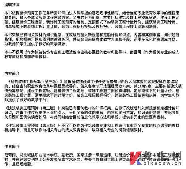 注 意 各省相同课程的指定教材不一定相同,请确认该教材版本正确再购买。该教材版本:建筑装饰工程预算 范菊雨 北京大学出版社 2021年版第3版